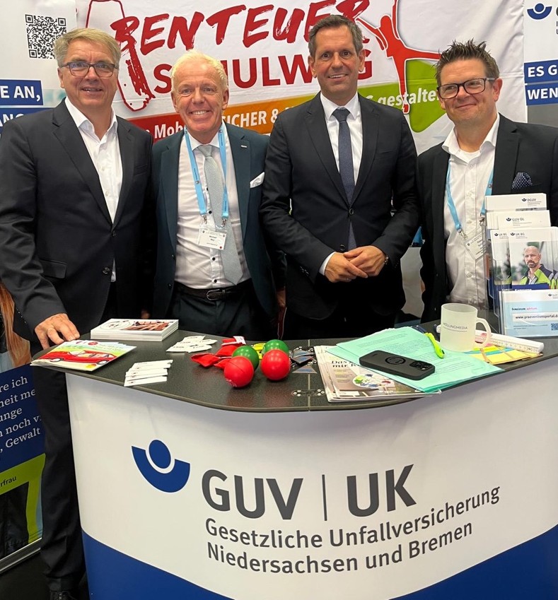 Bild li. ©GUV Hannover -Besuch des stellvertretenden Präsidiumsmitglieds des Niedersächsischen Städtetages Torsten Rohde, Bürgermeister der Stadt Osterholz Scharmbeck (Bildmitte). Bild re. ©GUV Hannover - Infostand der öffentlichen Unfallversicherungsträger