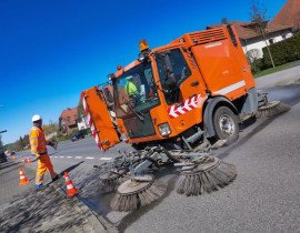 Die Kehrmaschine ruckelt auf einer Straße mit Unebenheiten und Schlaglöchern. Der Fahrer in der Fahrzeugkabine wird dabei ordentlich durchgeschüttelt. Wie schädlliche Vibrationen vermieden werden können erfahren Sie über das Portal für Sicherheitsbeauftragte.